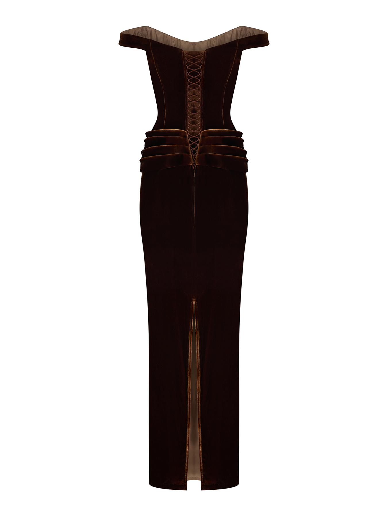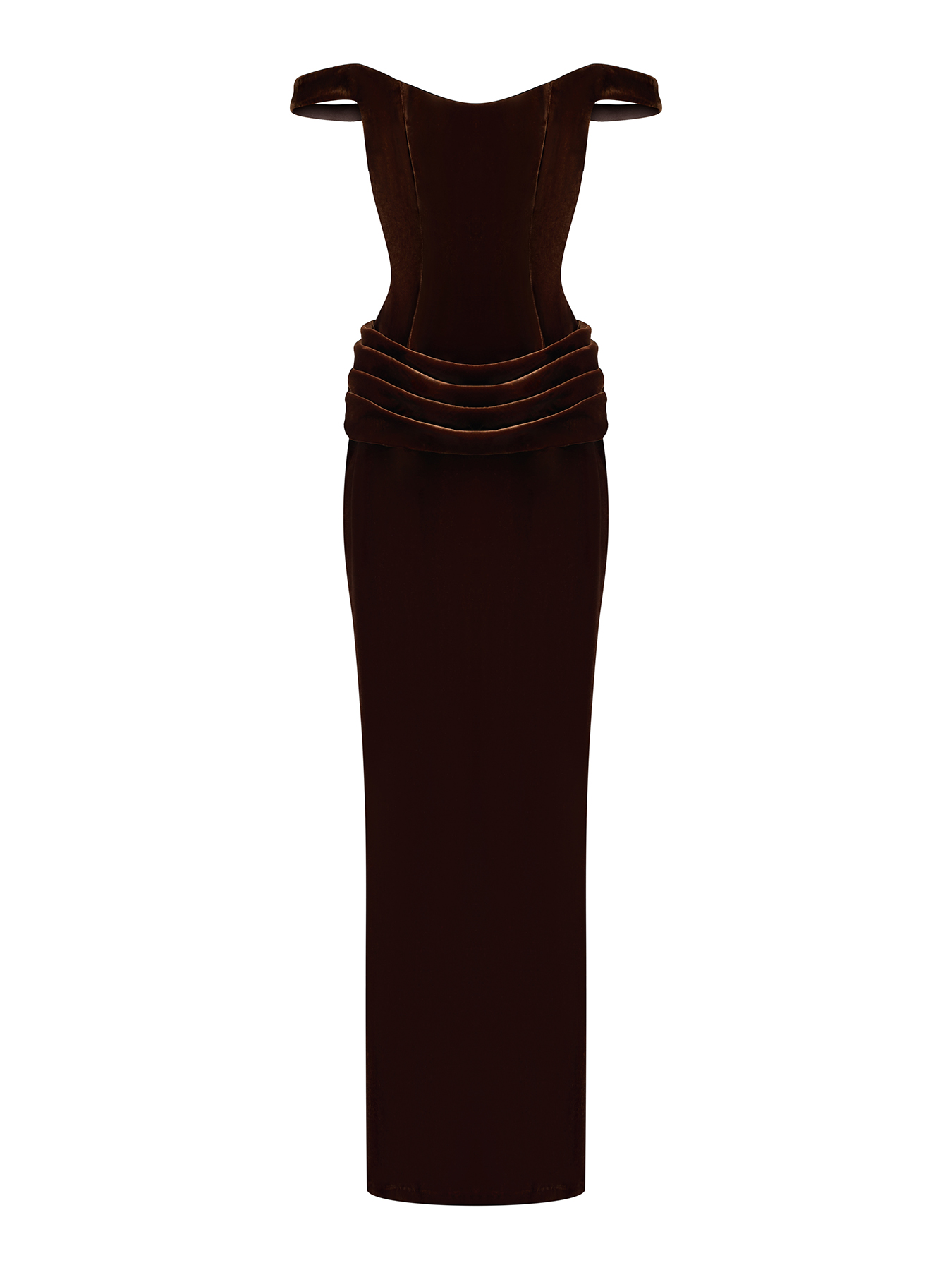 Макси-платье структурированного силуэта с открытыми плечами и объемной драпировкой на бедрах, изготовленное из шелкового бархата. Внутренний корсет на металлических косточках формирует красиво очерченную талию.