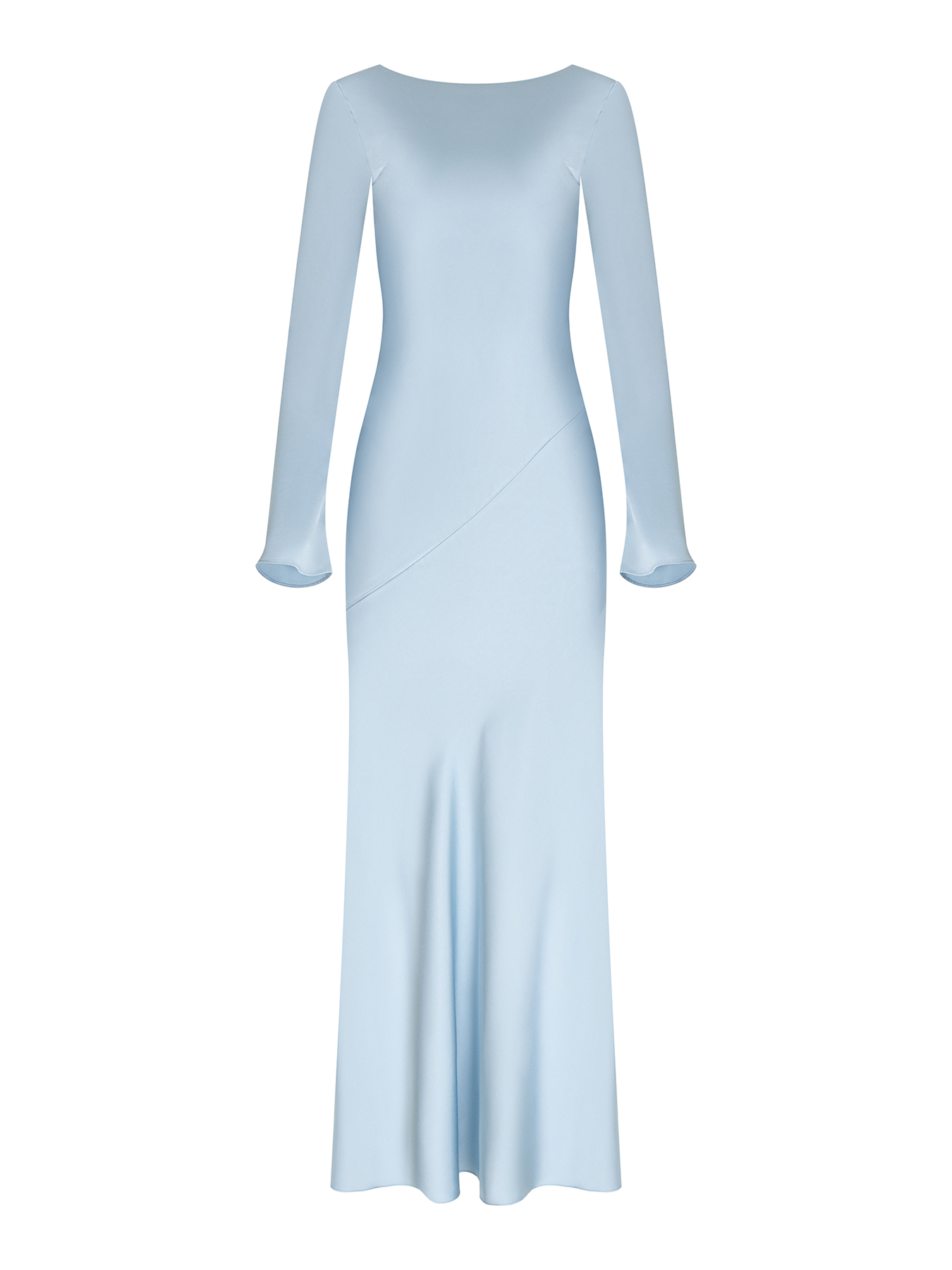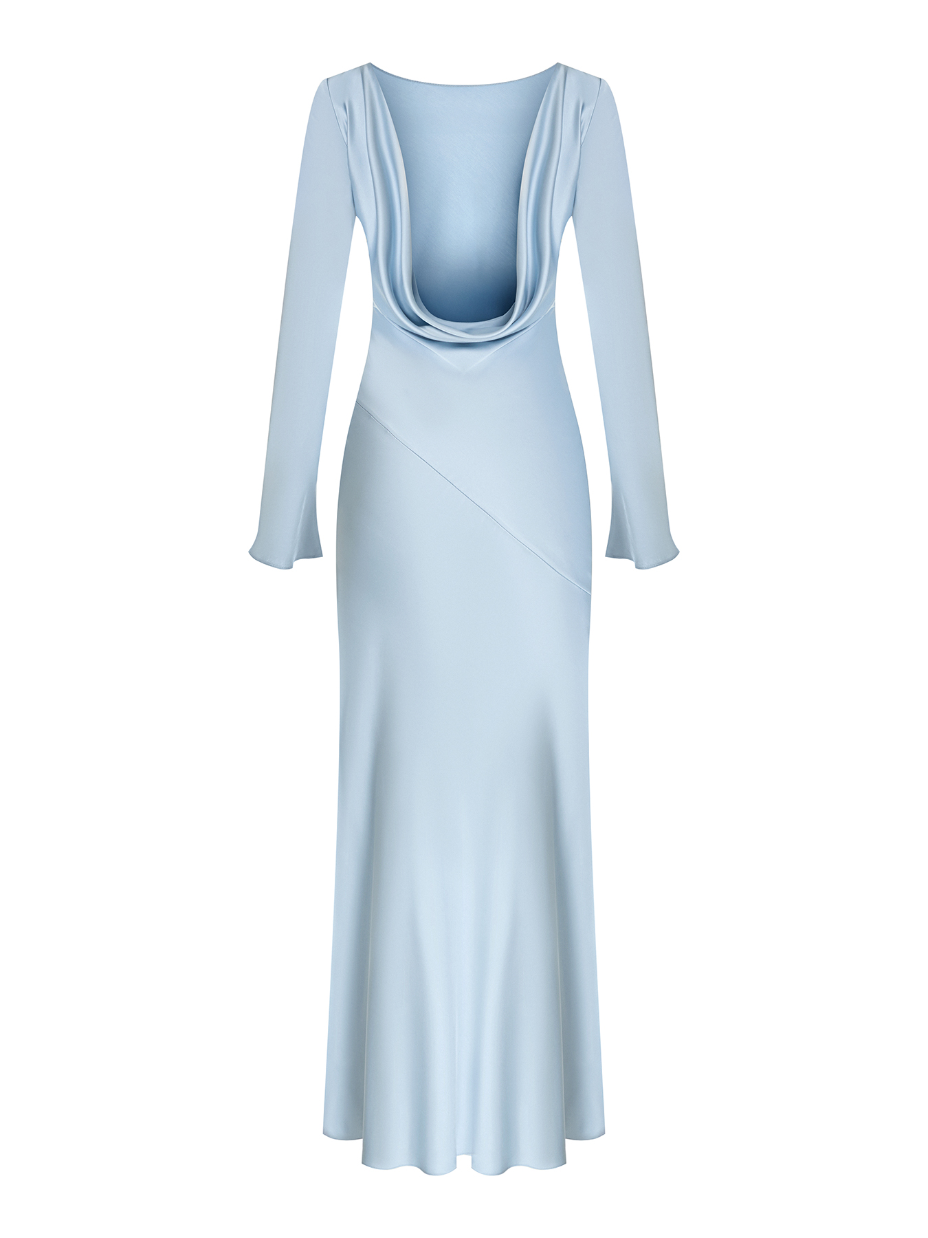 Платье в пол из шелковой вискозы, скроенное по косой. Лиф с горловиной-лодочкой дополнен длинными рукавами с легким расклешением, спинка украшена глубоким драпированным вырезом до линии поясницы.