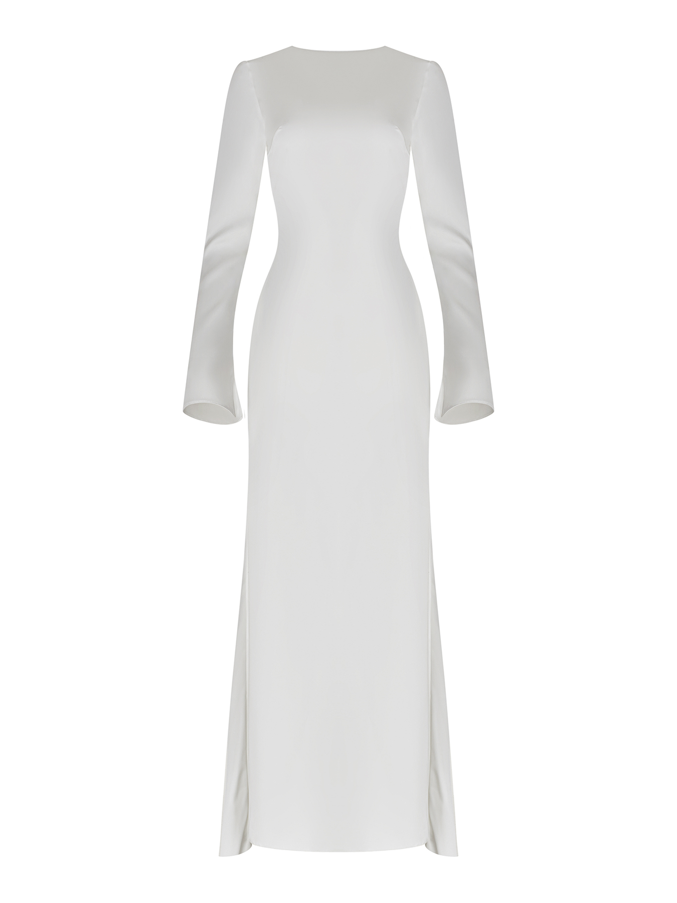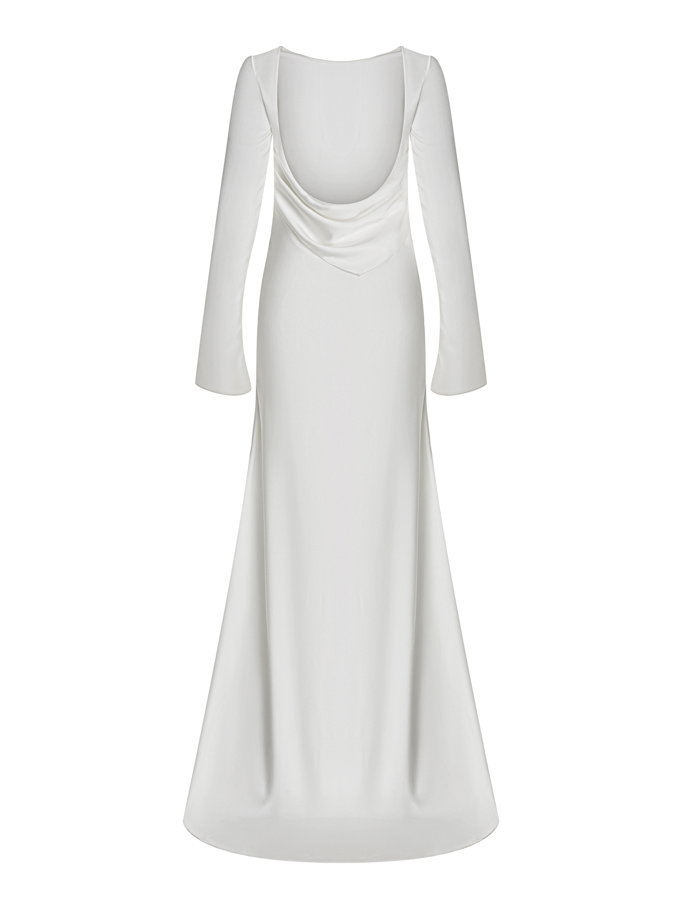 Платье в пол с длинными рукавами и шлейфом. Особый акцент сделан на спинке: глубокий вырез дополнен изящной драпировкой по линии поясницы, которая создает плавный переход силуэта и добавляет образу утончённости.