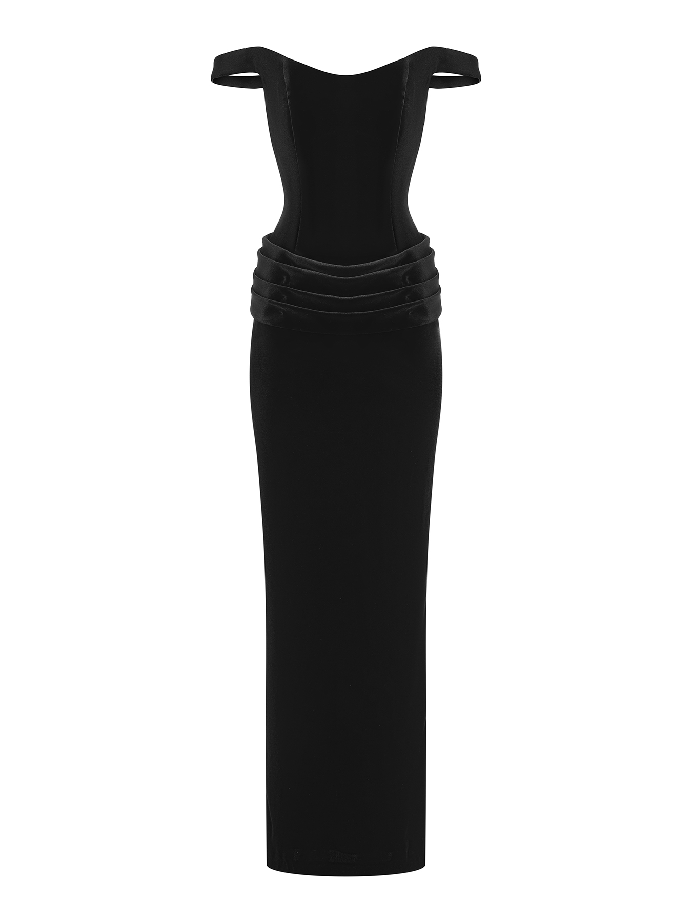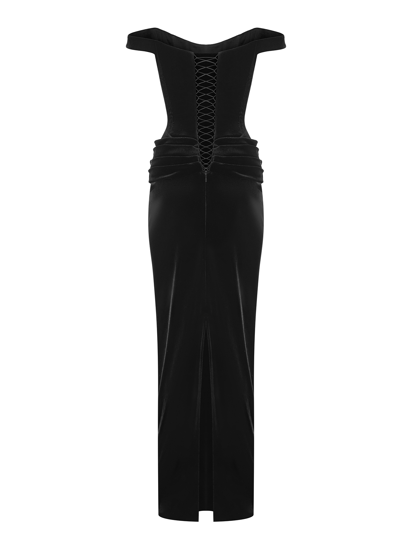 Платье из бархата с корсетным лифом и открытыми плечами на спущенных бретелях. Облегающий крой с драпировкой по линии бедер плавно переходит в расклешённую юбку в пол.