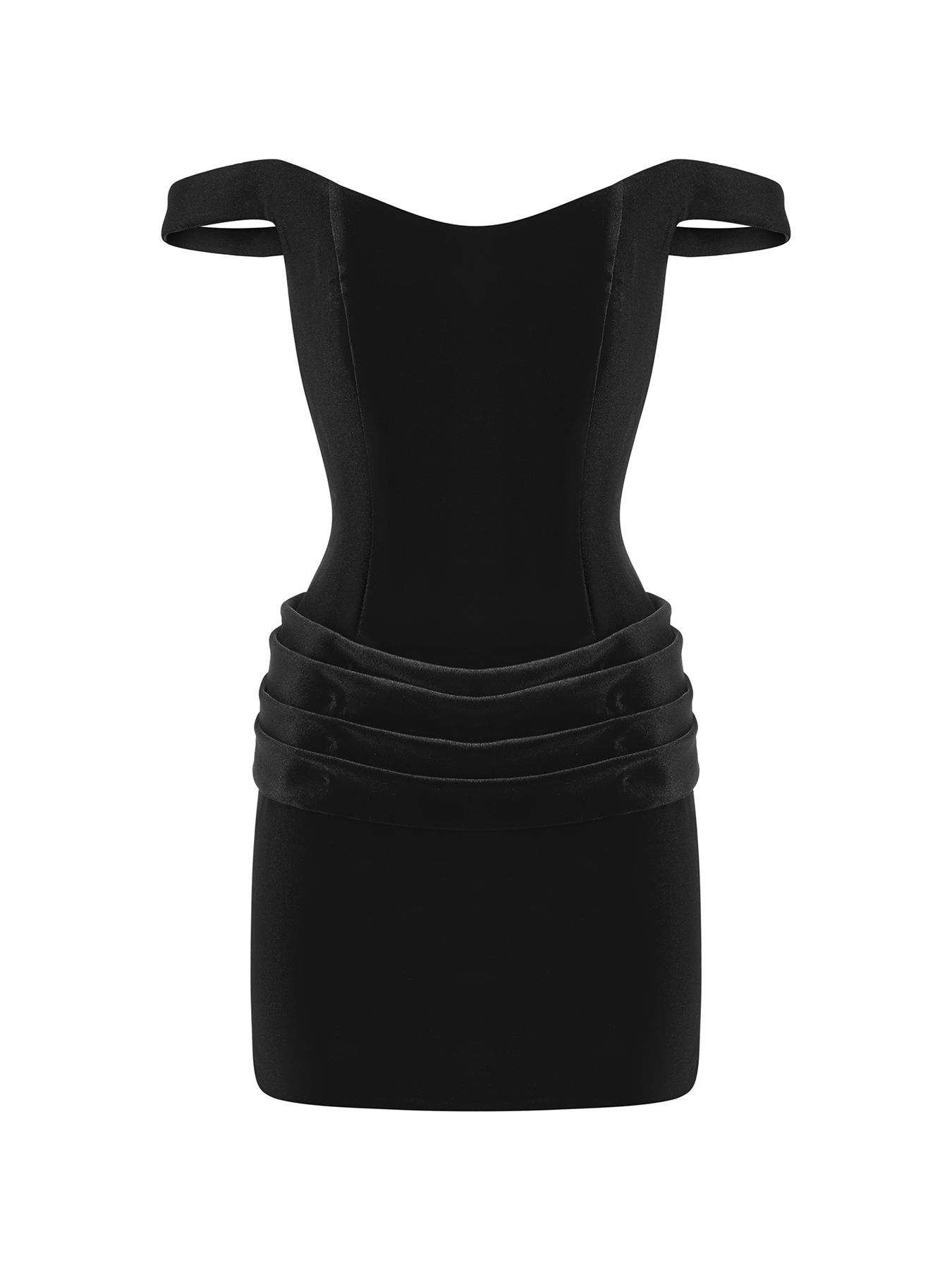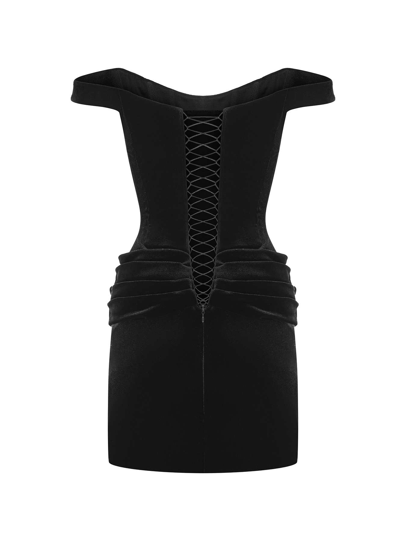 Платье мини из бархата с корсетным лифом и открытыми плечами на спущенных бретелях. Облегающий крой с драпировкой по линии бедер.