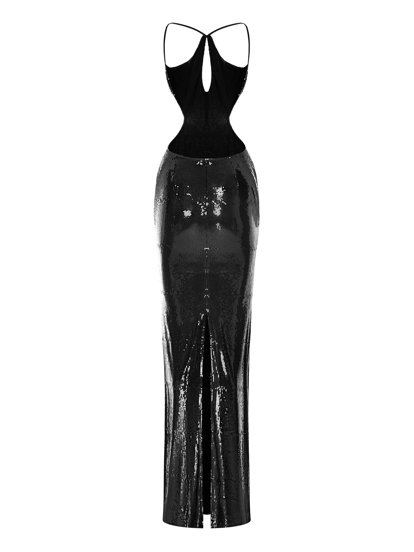 Платье макси, полностью расшитое пайетками, облегающего силуэта и мягким расширением к низу. Лиф с глубоким фигурным вырезом и перемычкой на тонких бретелях, спинка открытая. Застёжка — потайная молния по среднему шву.