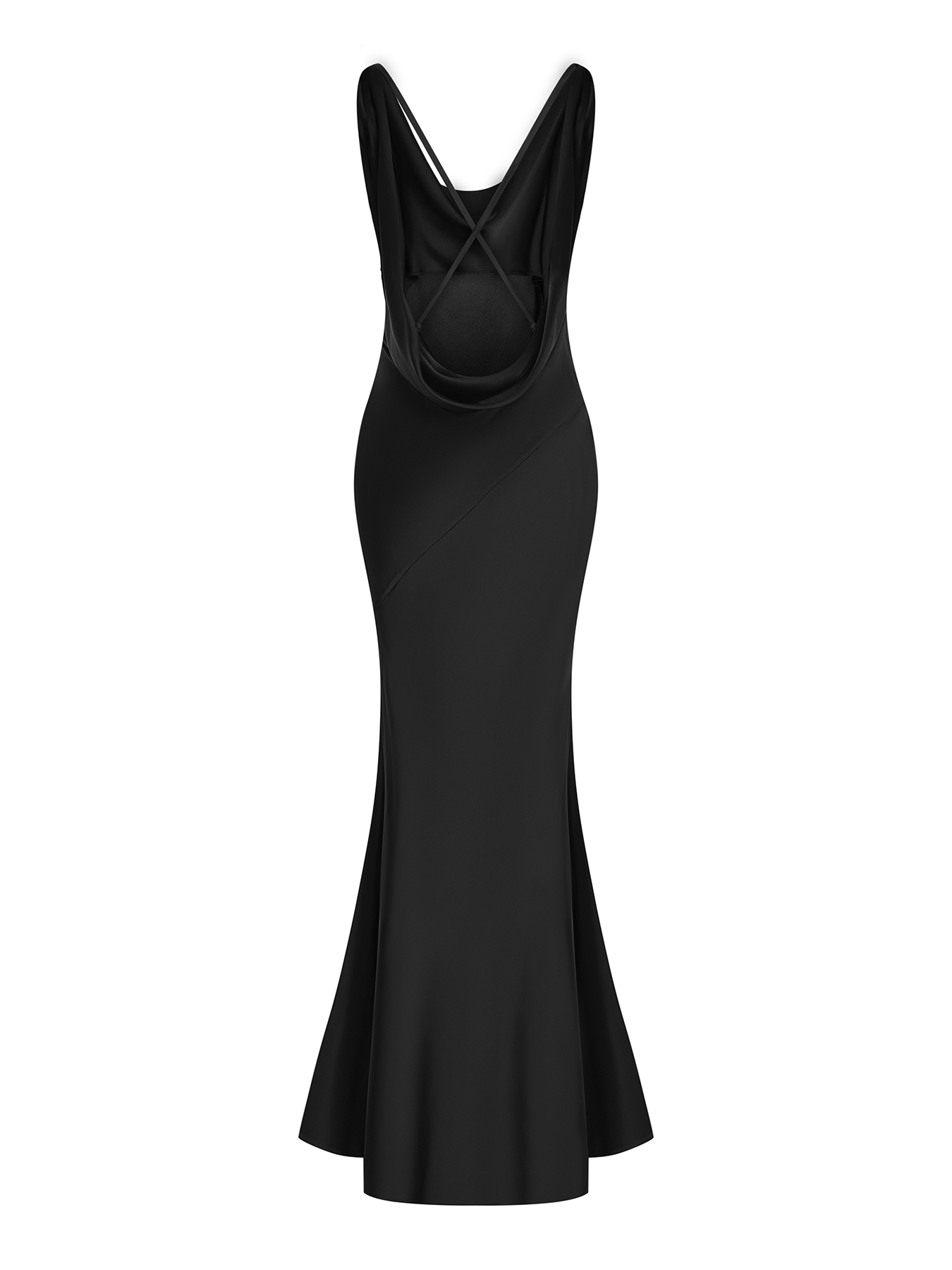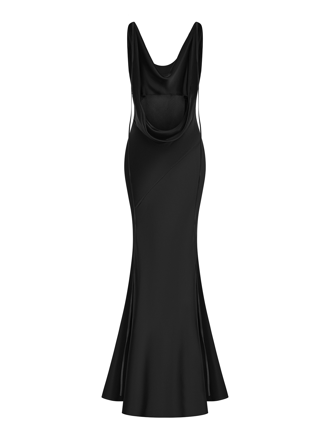 Шёлковое платье по косой с драпировкой на спине и вырезом «качели». Регулируемые завязки и акцентные шёлковые пуговицы на талии позволяют менять глубину выреза, подчеркивая изящную линию спины.