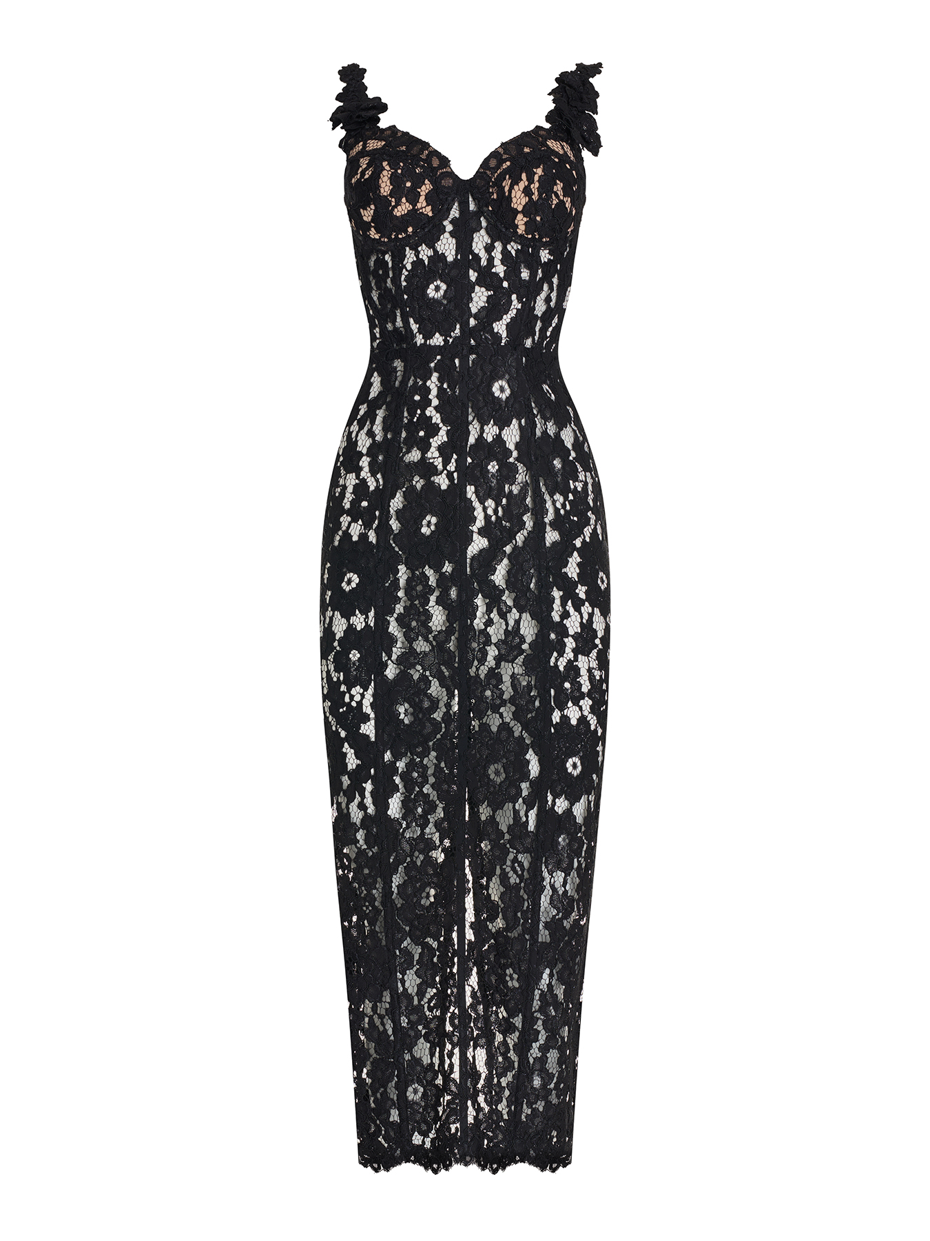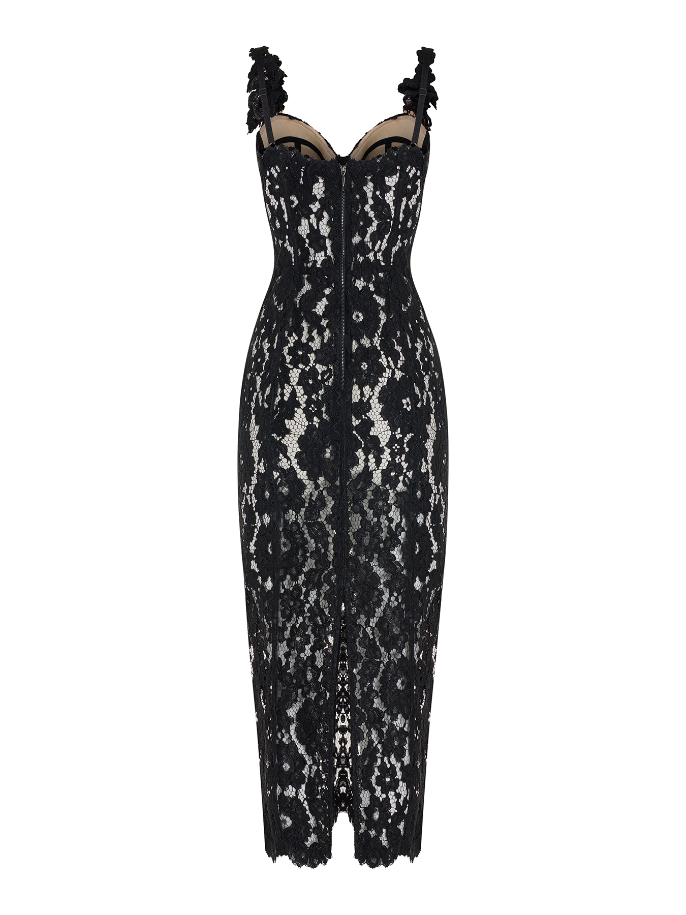 Платье миди из итальянского кордового кружева с корсетным лифом и декоративными бретелями, украшенными кружевными цветами. Платье ручной работы. На подкладке.