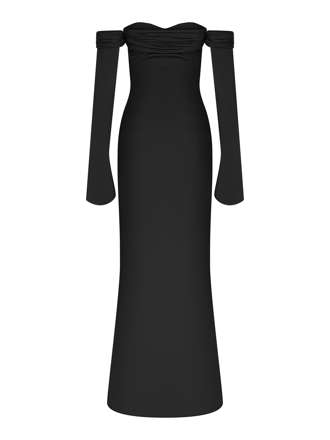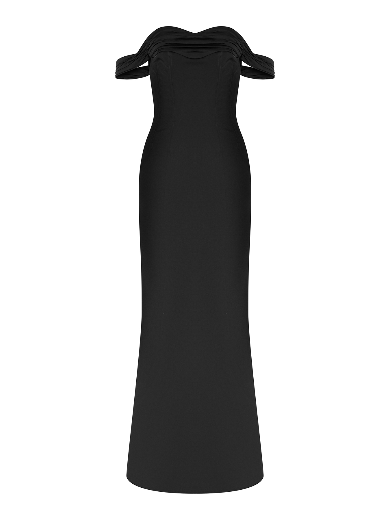Платье на корсете с открытой линией плеча и съемными рукавами. Лиф выполнен с мягкой драпировкой, создающей изящный акцент в верхней части.